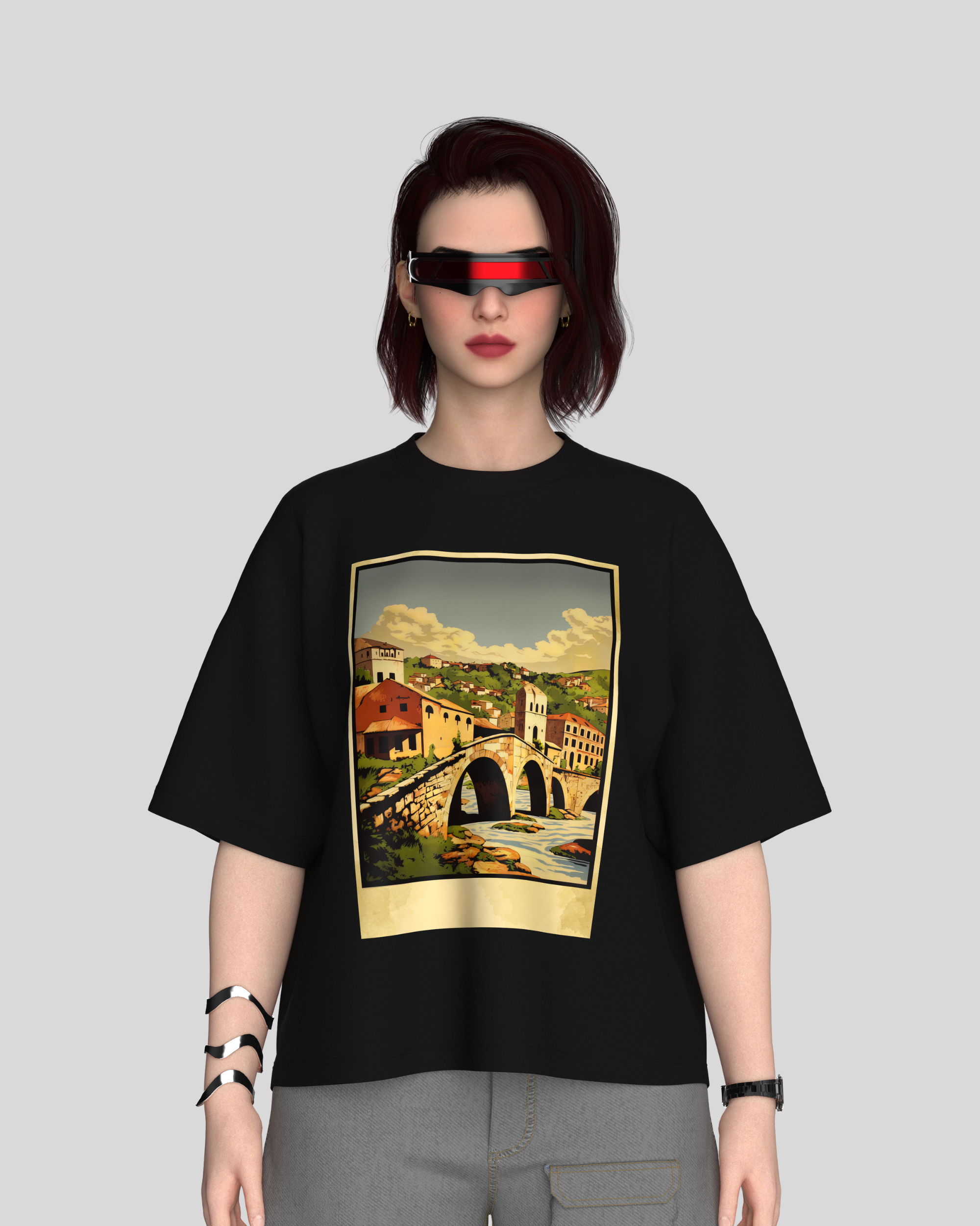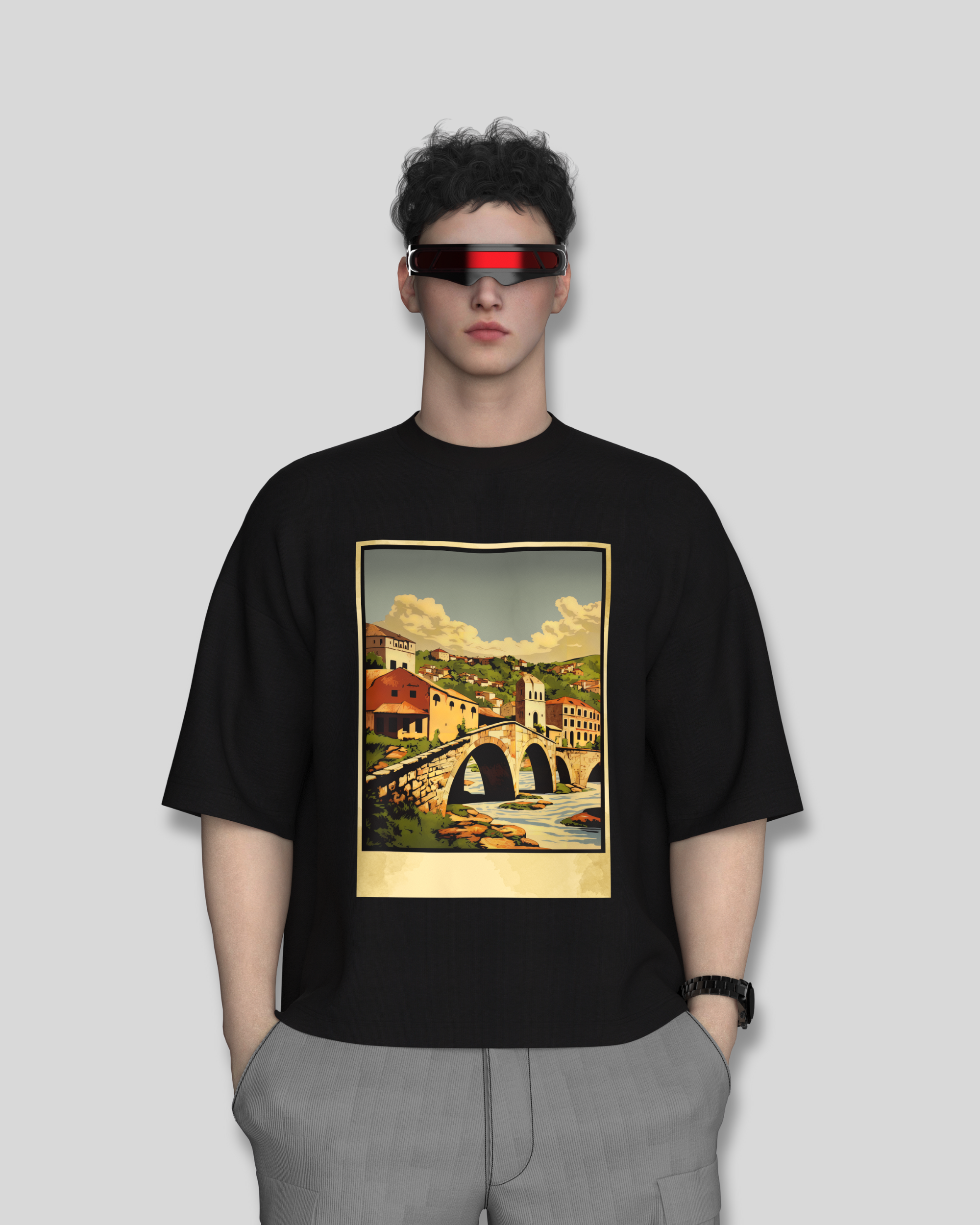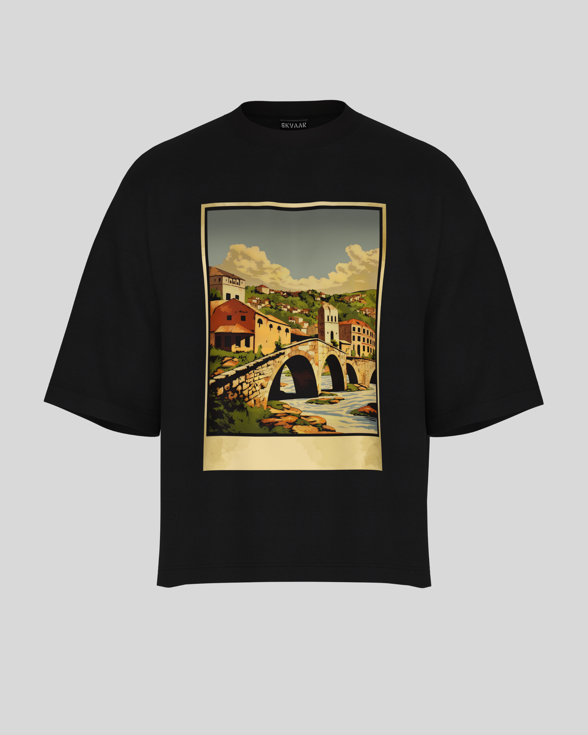 Wear a piece of history with the Ancient Bridge Oversized T-Shirt. This cool graphic tee shows a beautiful, hand-drawn picture of an old stone bridge crossing a river, with old buildings and green hills behind it. It’s more than just a shirt; it’s like wearing a story of old times and beautiful places. It makes you think of peaceful towns and travel dreams.