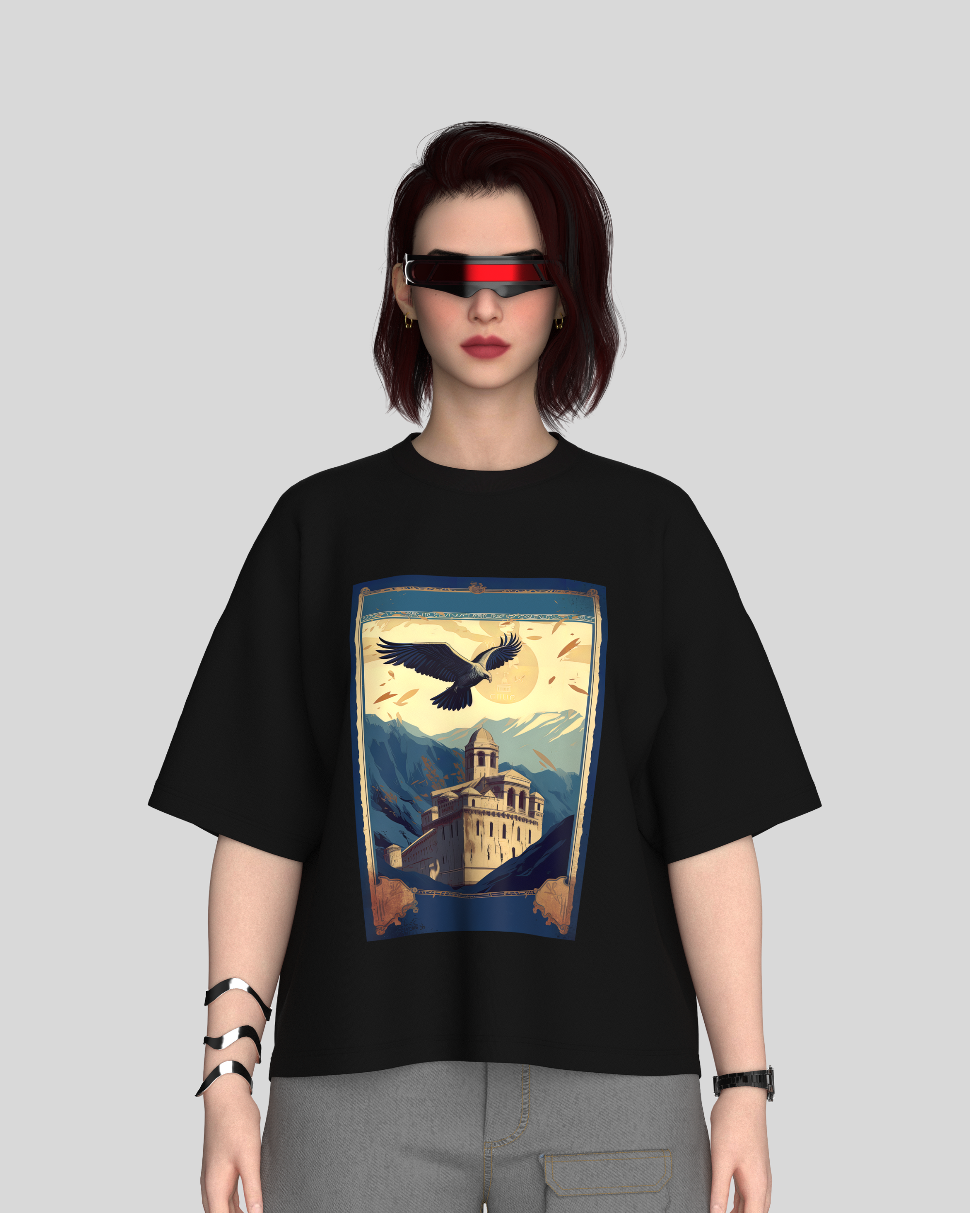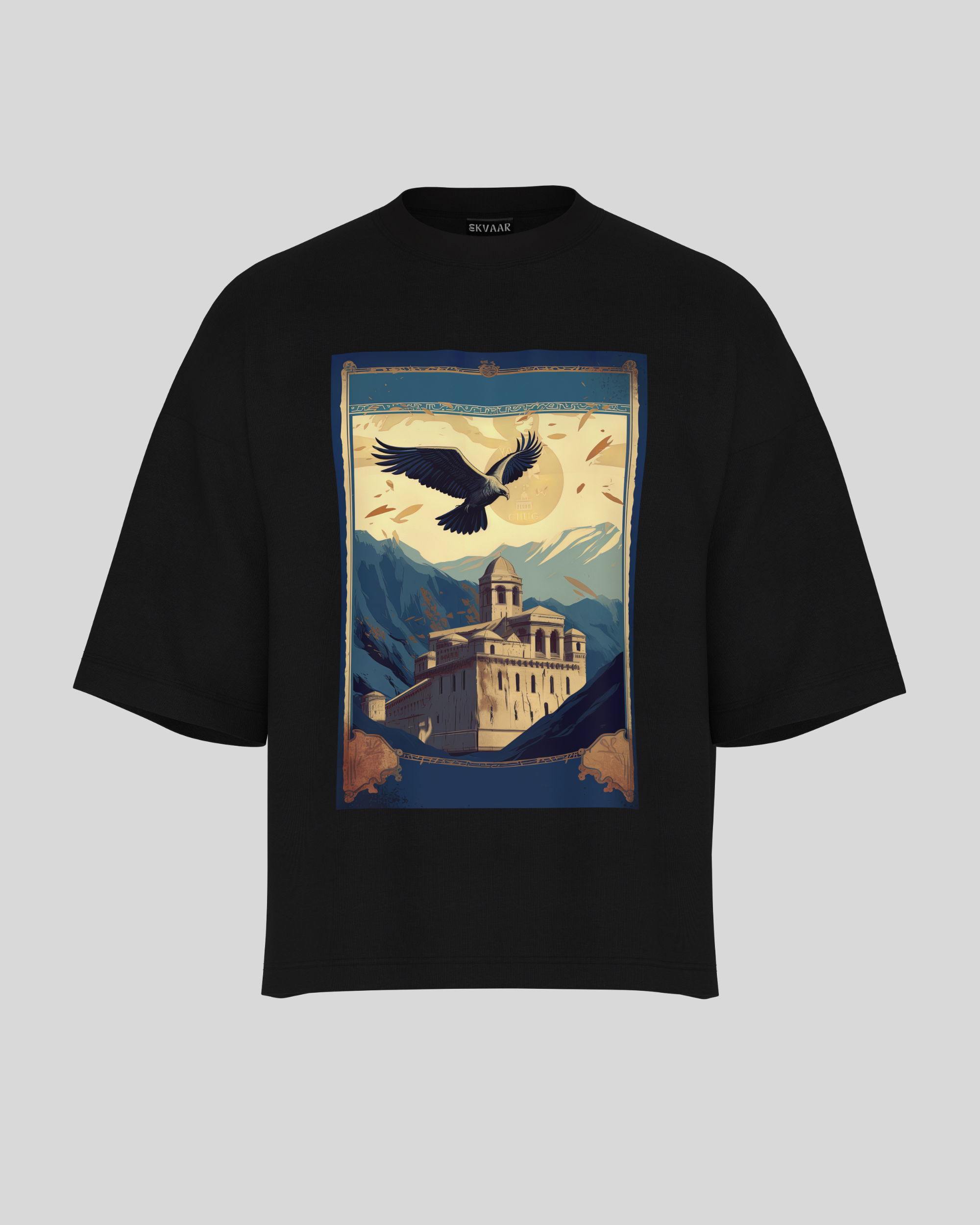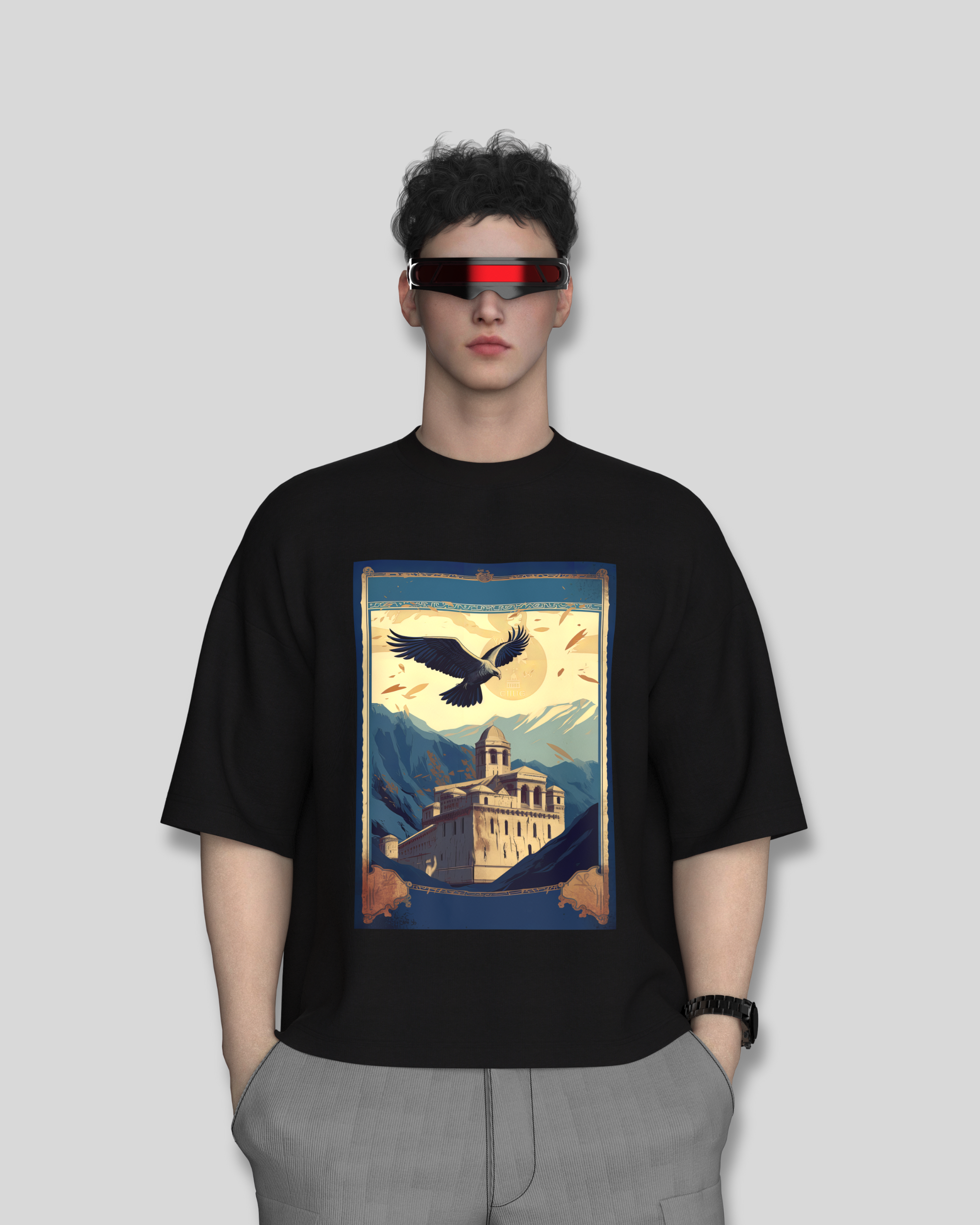 Ascend to new style heights with the Eagle’s Ascent Oversized T-Shirt. This striking graphic tee features a powerful hand-illustrated design depicting a majestic eagle soaring above an ancient, monastery-like structure nestled among mountains. It’s a tribute to freedom, heritage, and the untamed spirit of the wild.