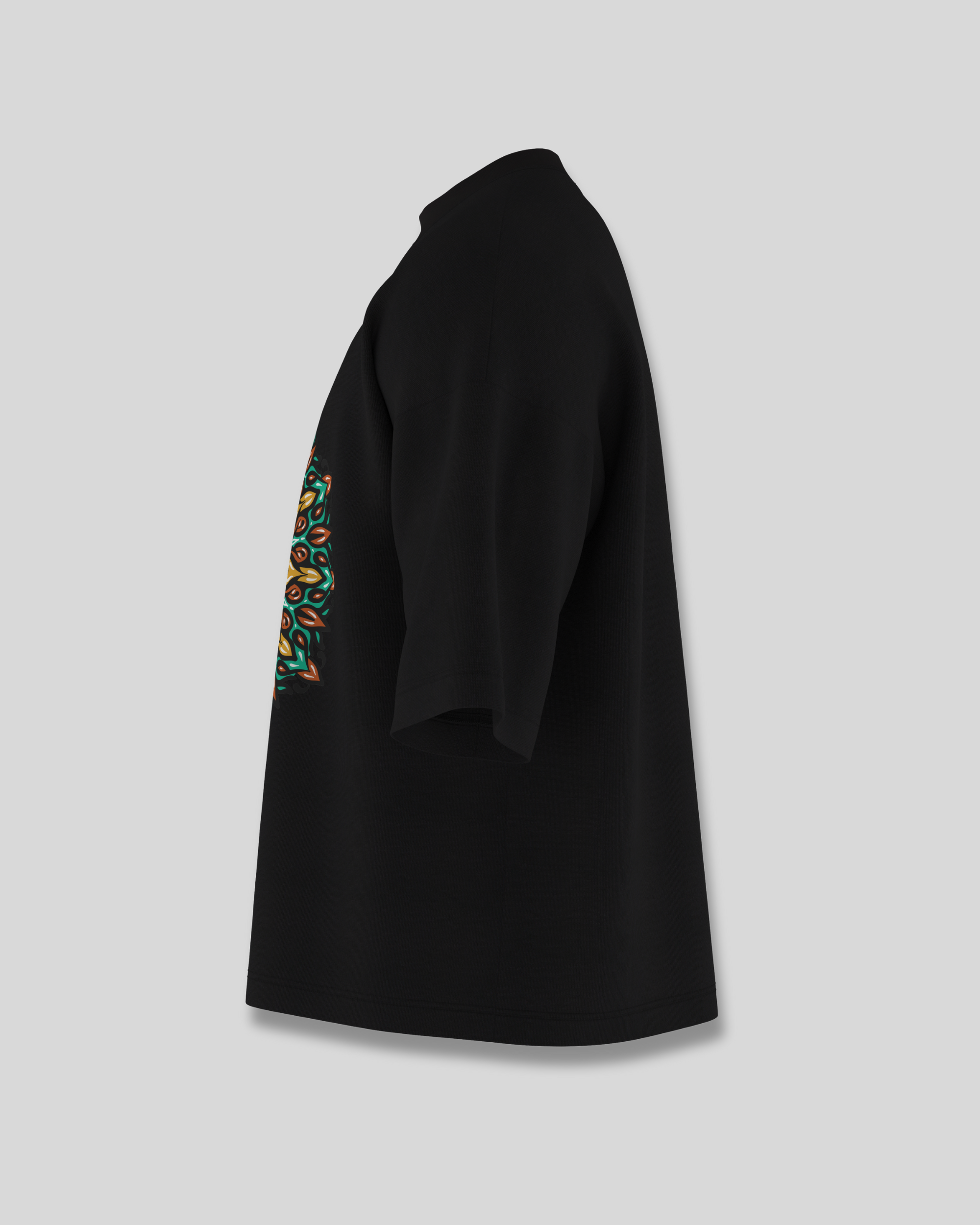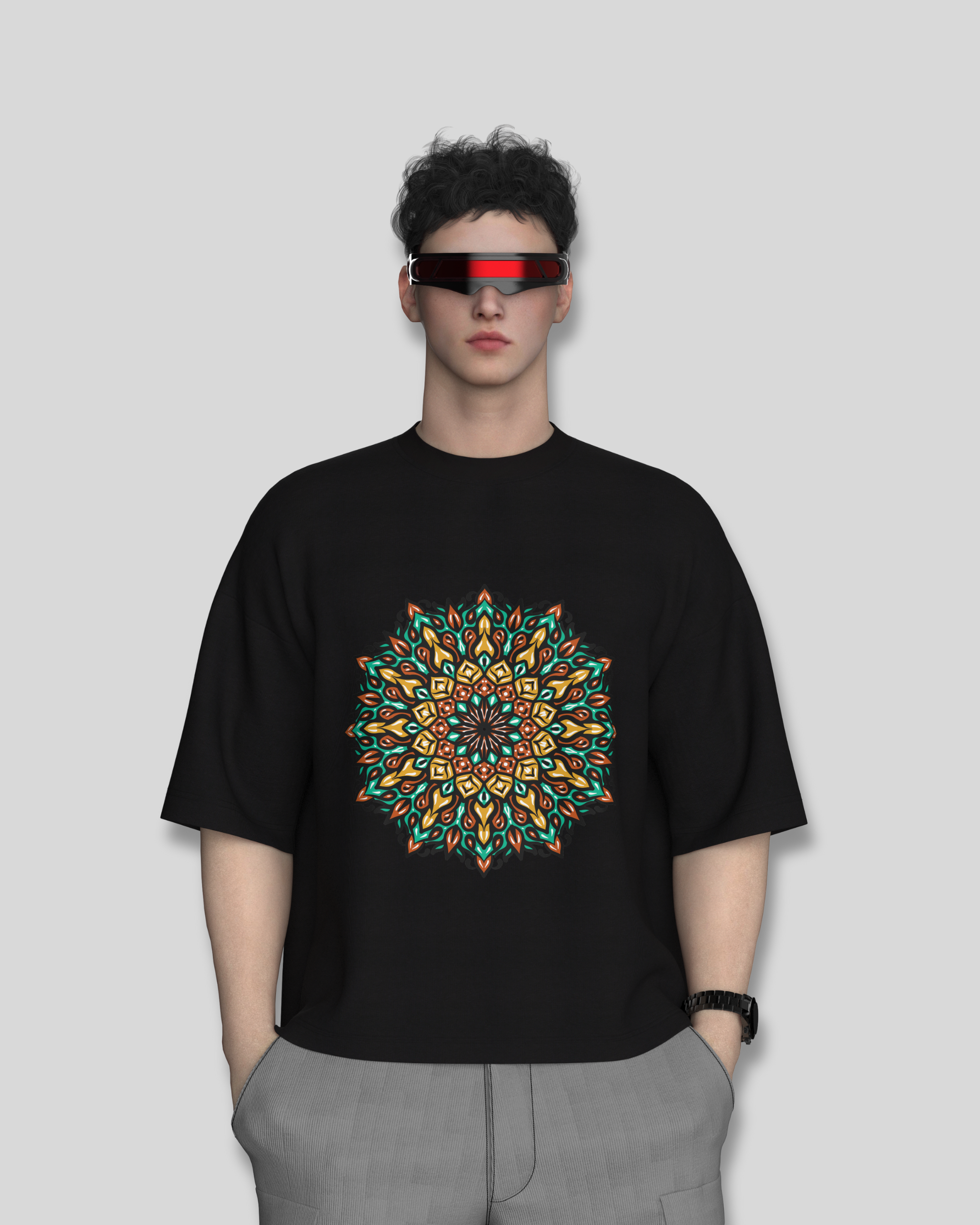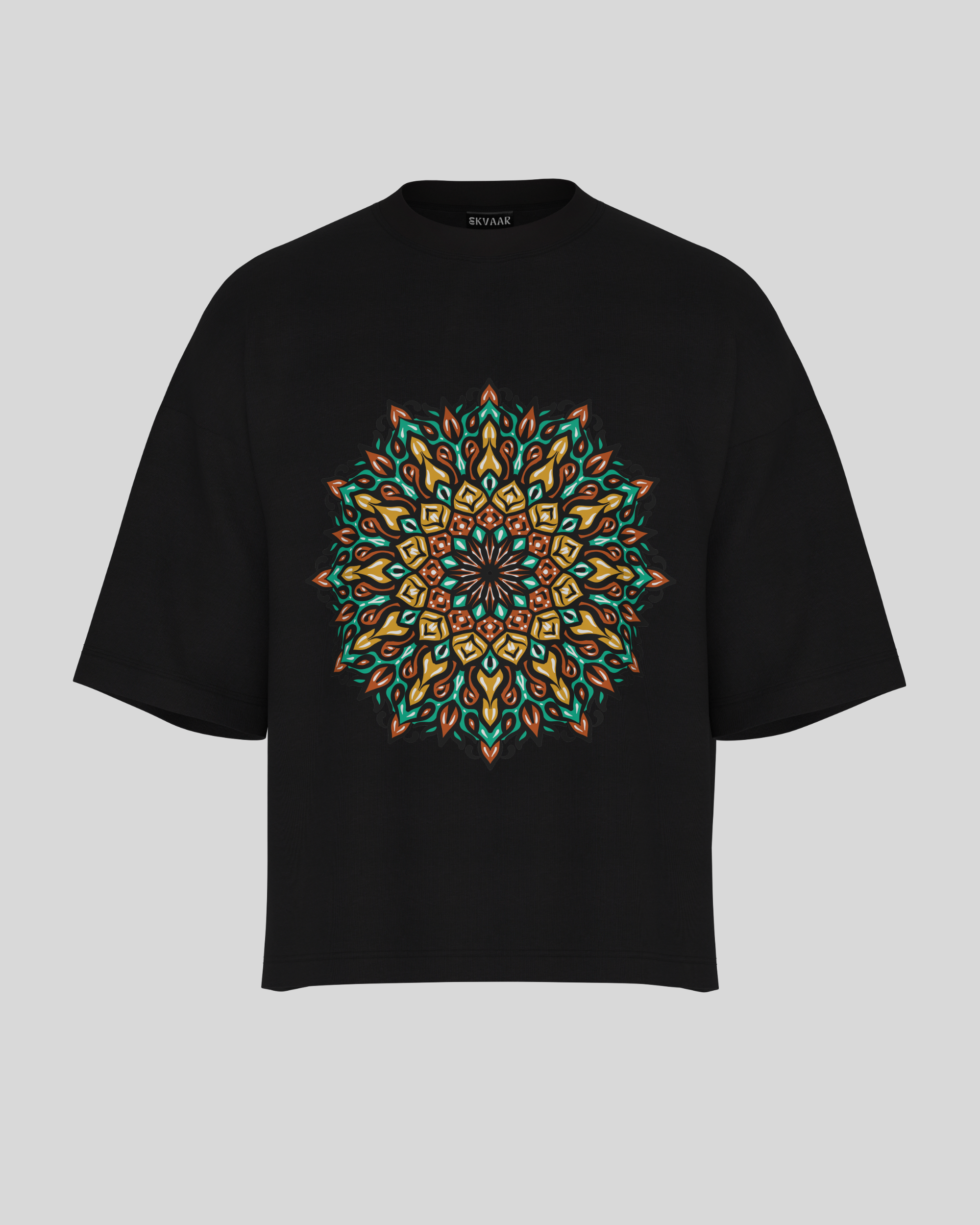 A kaleidoscopic statement for the mindful and the bold. This oversized tee features an exclusive EKVAAR mandala graphic — a fusion of fire, leaf, and eye motifs radiating in vibrant orange, teal, and amber hues. The back carries the EKVAAR mark in clean white — understated but unmistakable. Designed for those who walk the streets with presence and purpose.