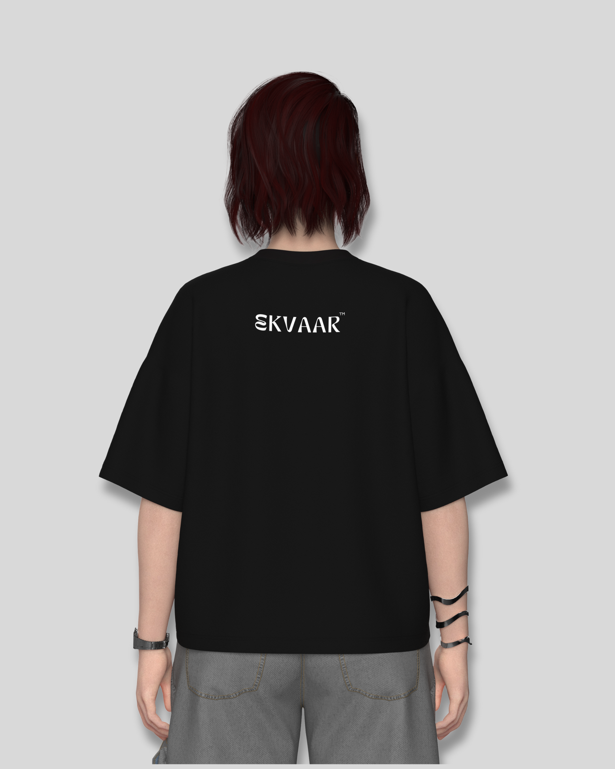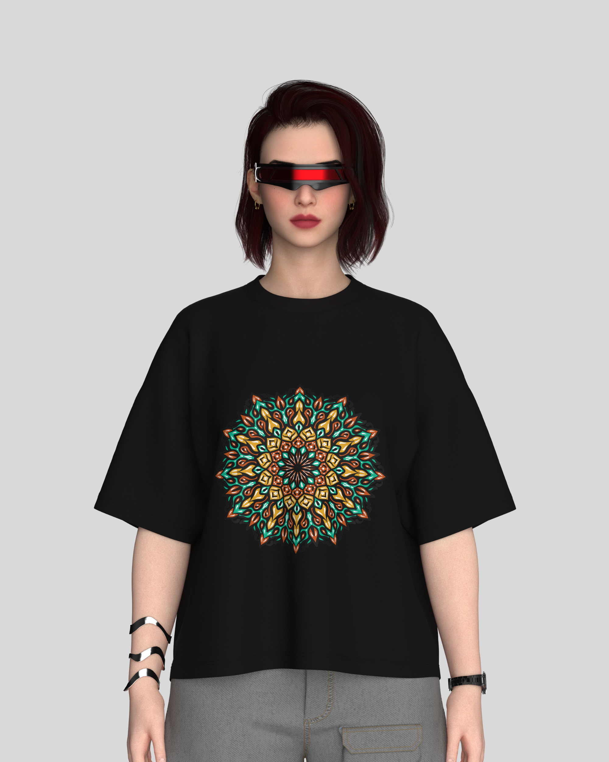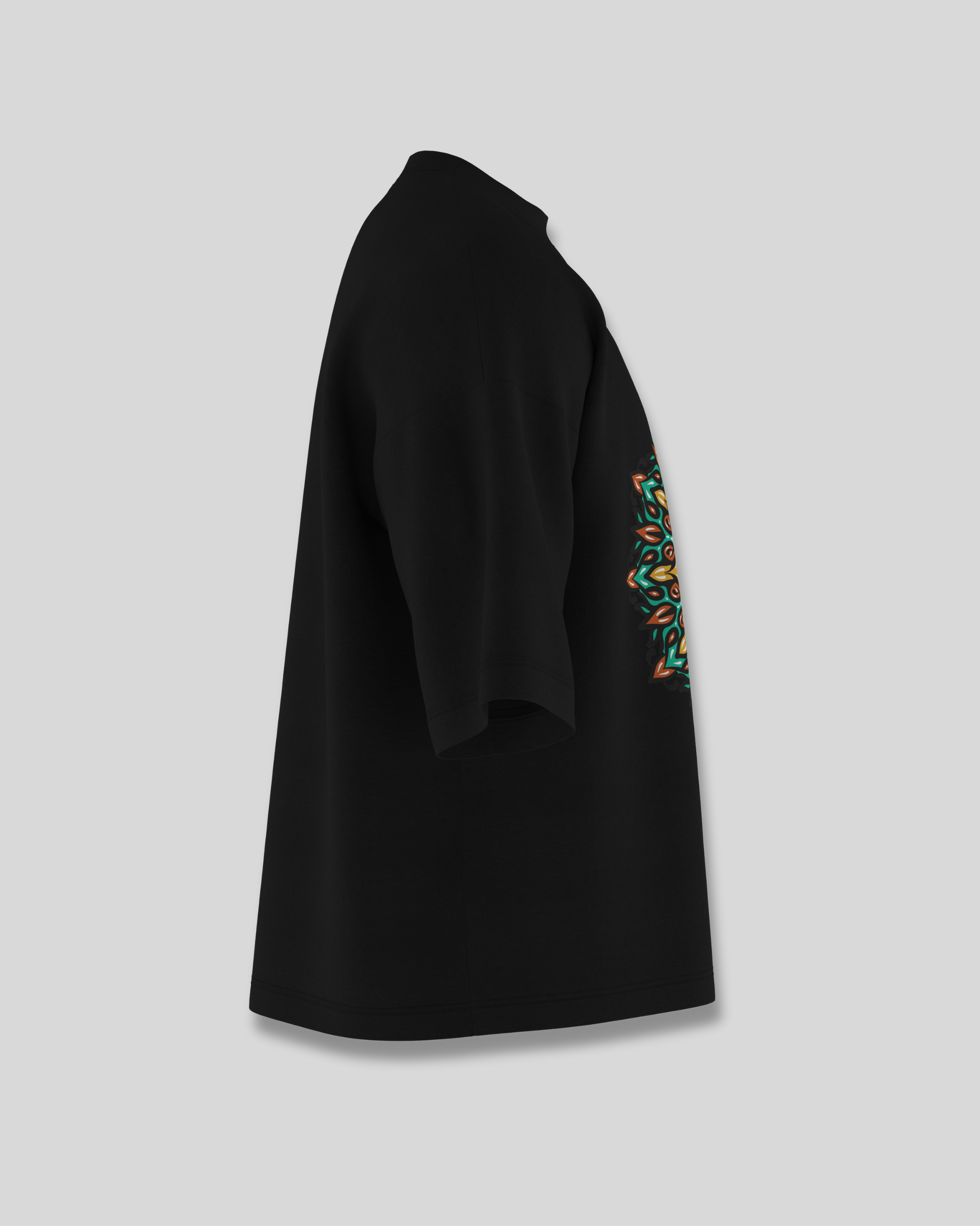A kaleidoscopic statement for the mindful and the bold. This oversized tee features an exclusive EKVAAR mandala graphic — a fusion of fire, leaf, and eye motifs radiating in vibrant orange, teal, and amber hues. The back carries the EKVAAR mark in clean white — understated but unmistakable. Designed for those who walk the streets with presence and purpose.