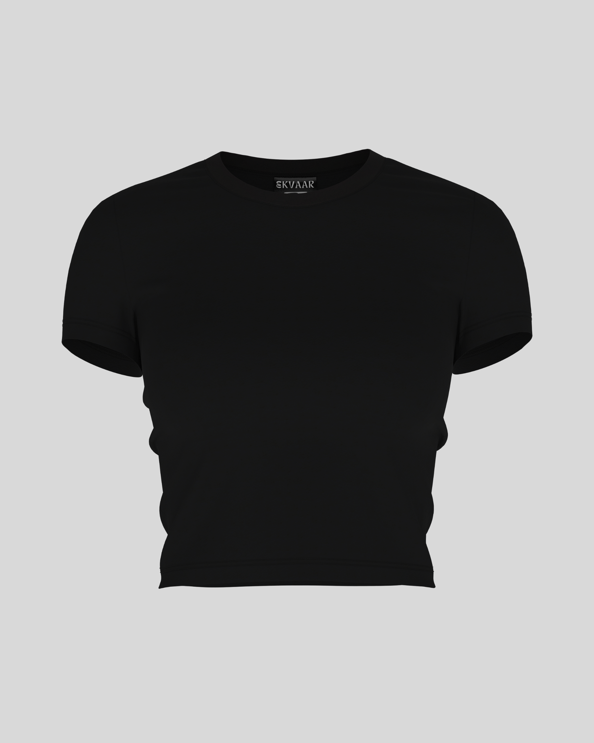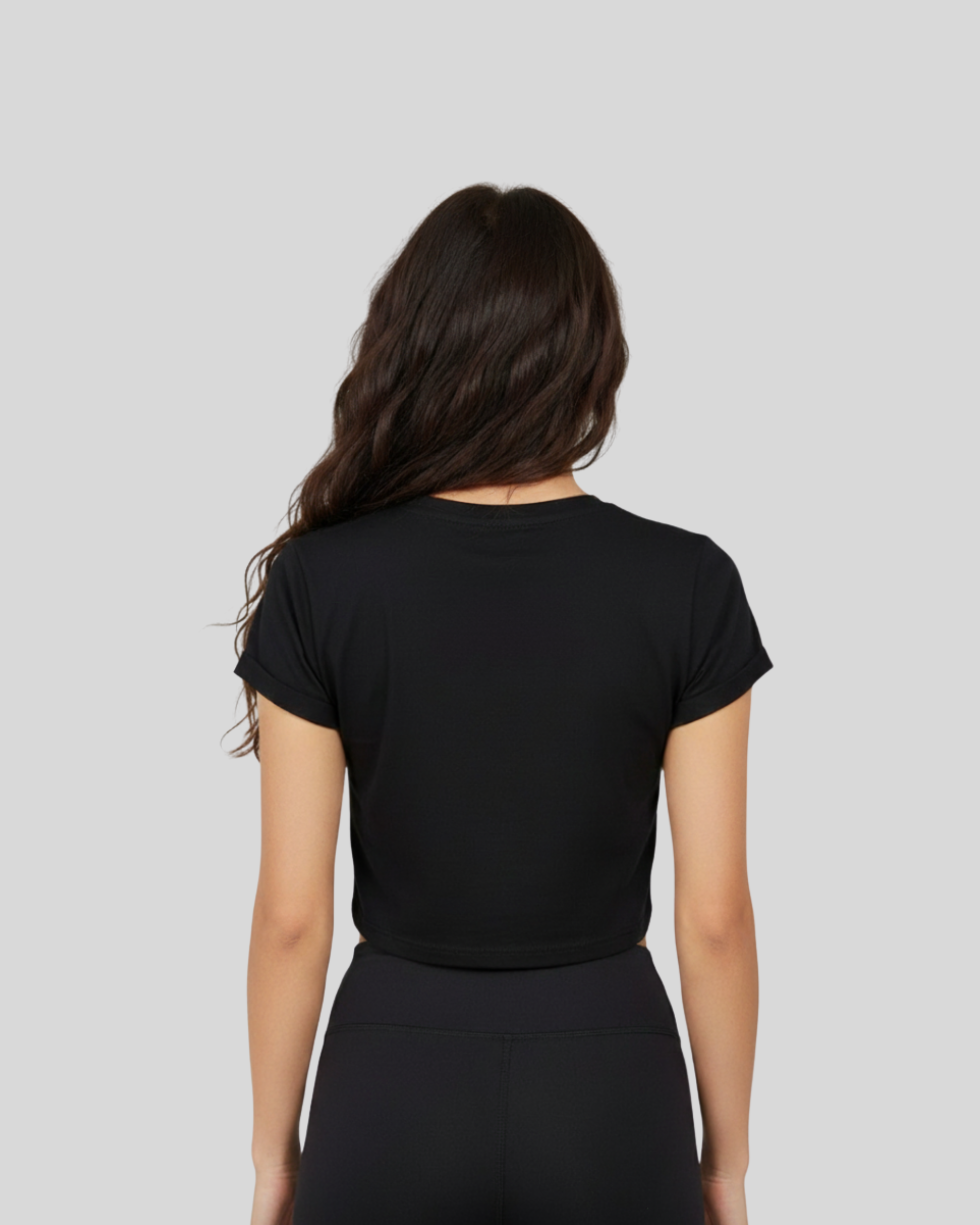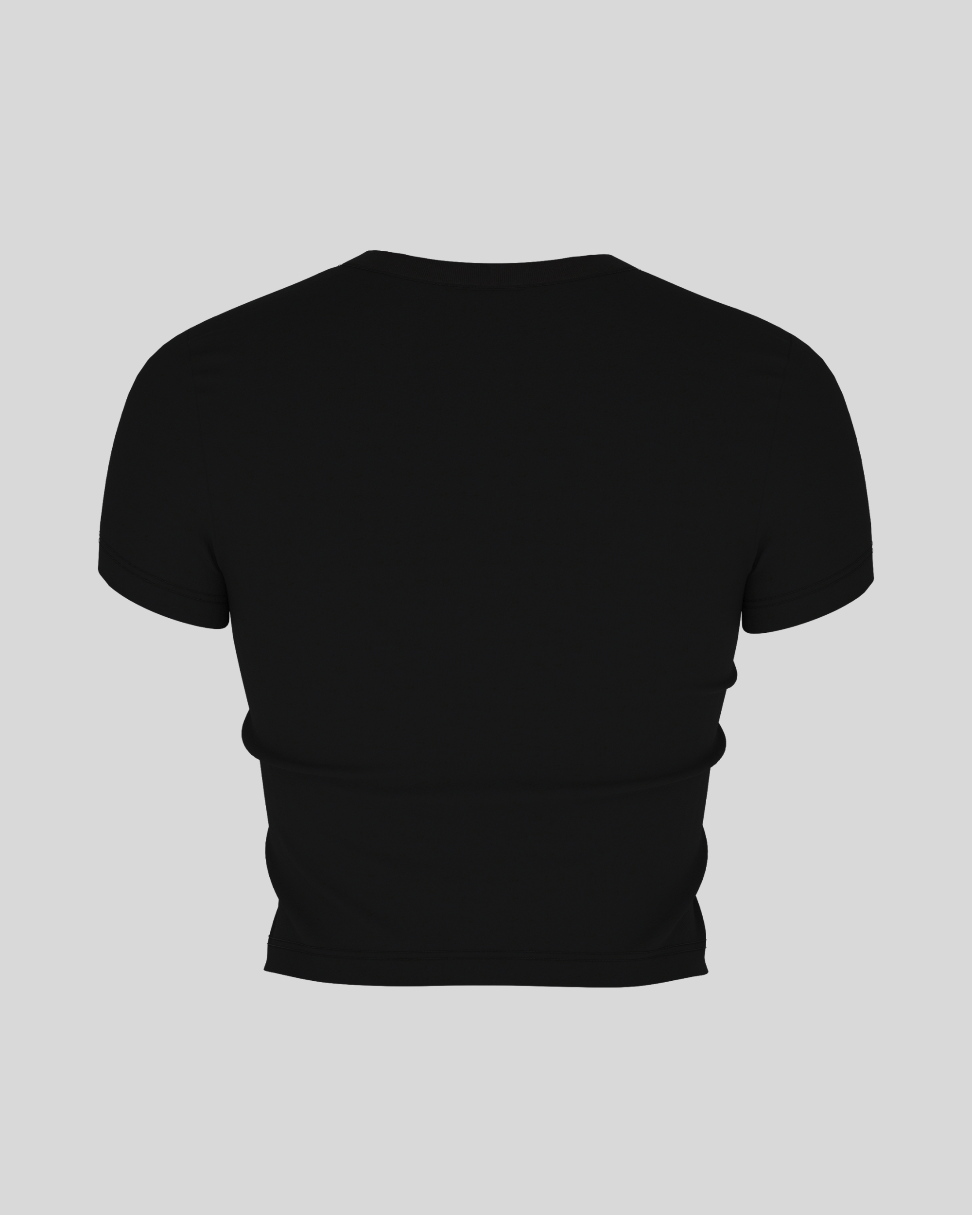 This cropped baby tee blends a soft cotton-spandex stretch with a snug, flattering fit. Designed for versatility, it works as a solo statement piece or layered, perfect for street, casual, or chic pairings.