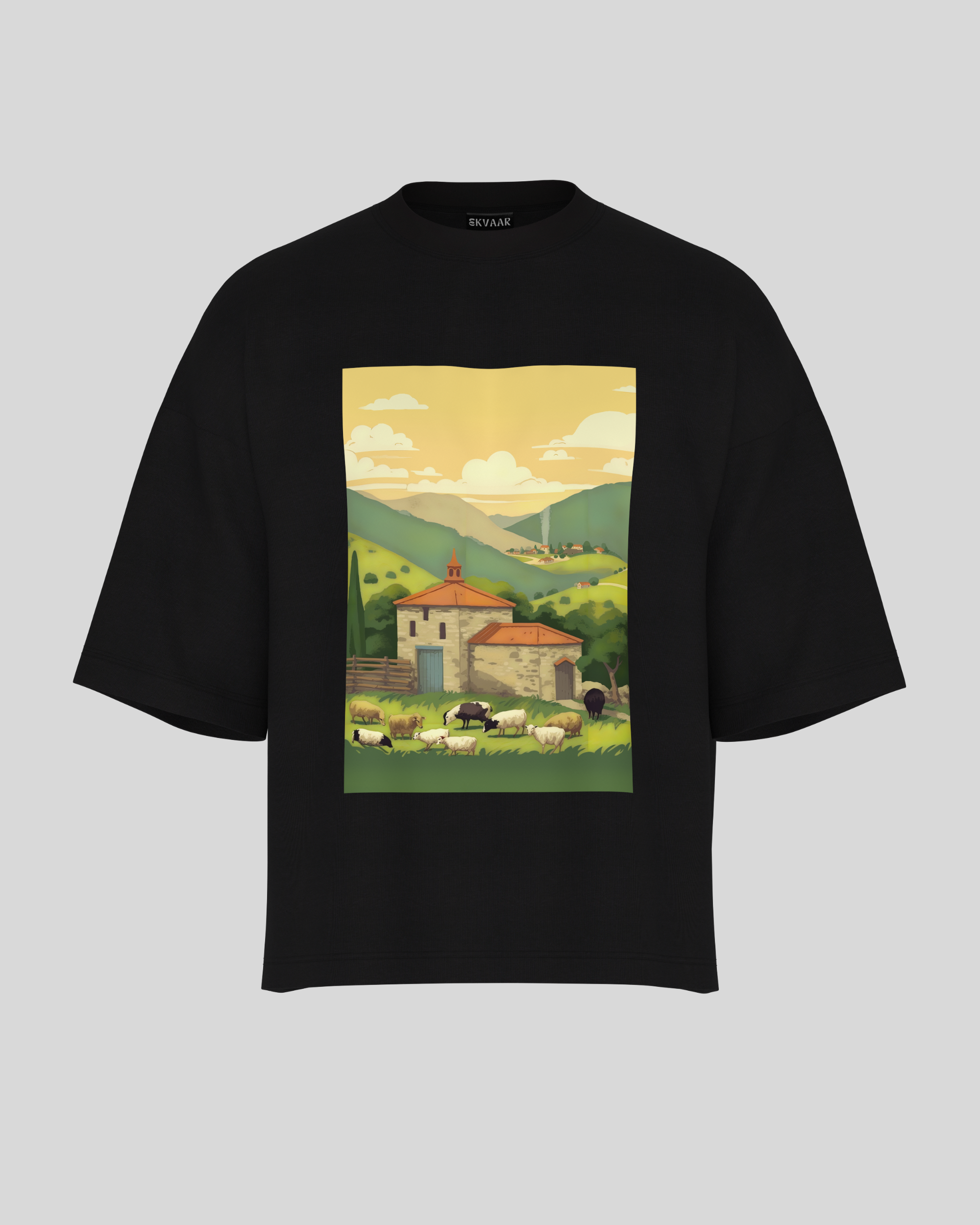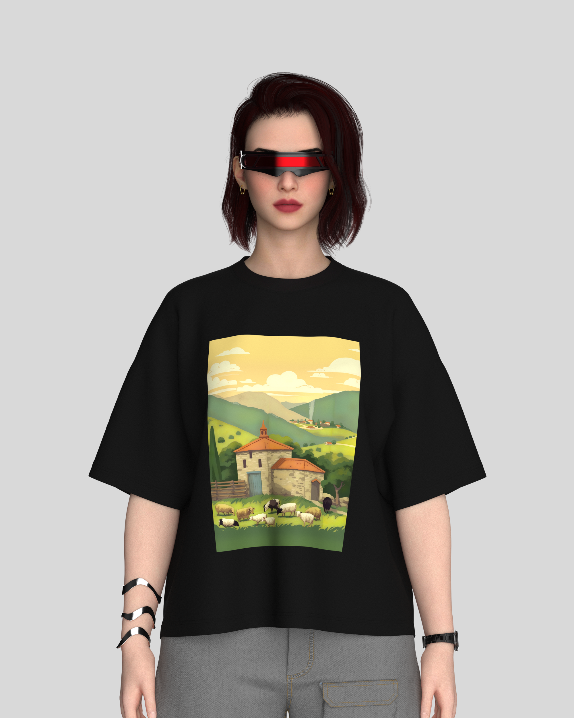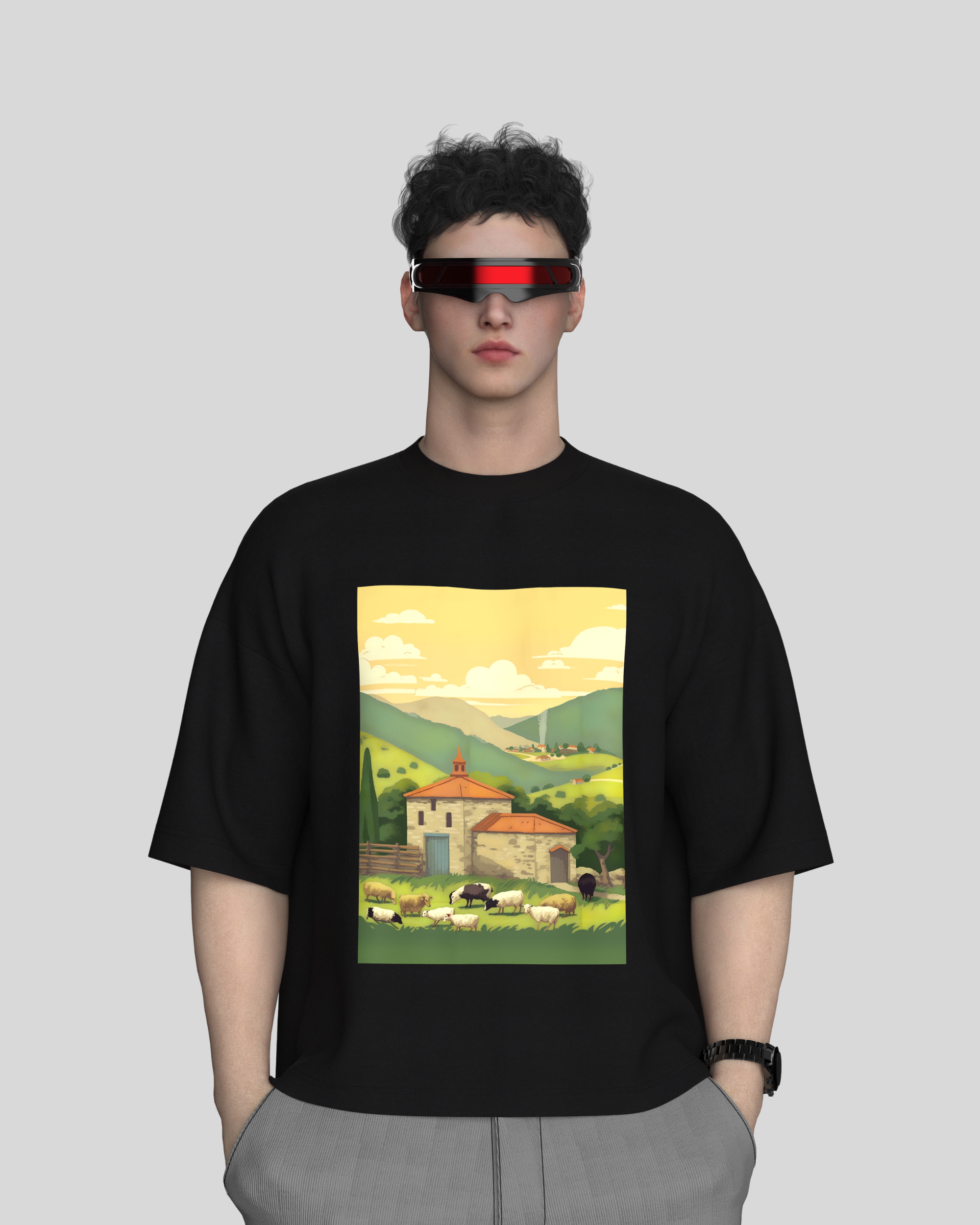 Escape to serene landscapes with the Pastoral Homestead Oversized T-Shirt. This charming graphic tee features a beautiful hand-illustrated scene of a quaint stone house with a red-tiled roof, nestled in rolling green hills with grazing sheep under a bright, tranquil sky. It’s more than just apparel; it’s a celebration of rustic beauty, peaceful country life, and timeless tranquility.