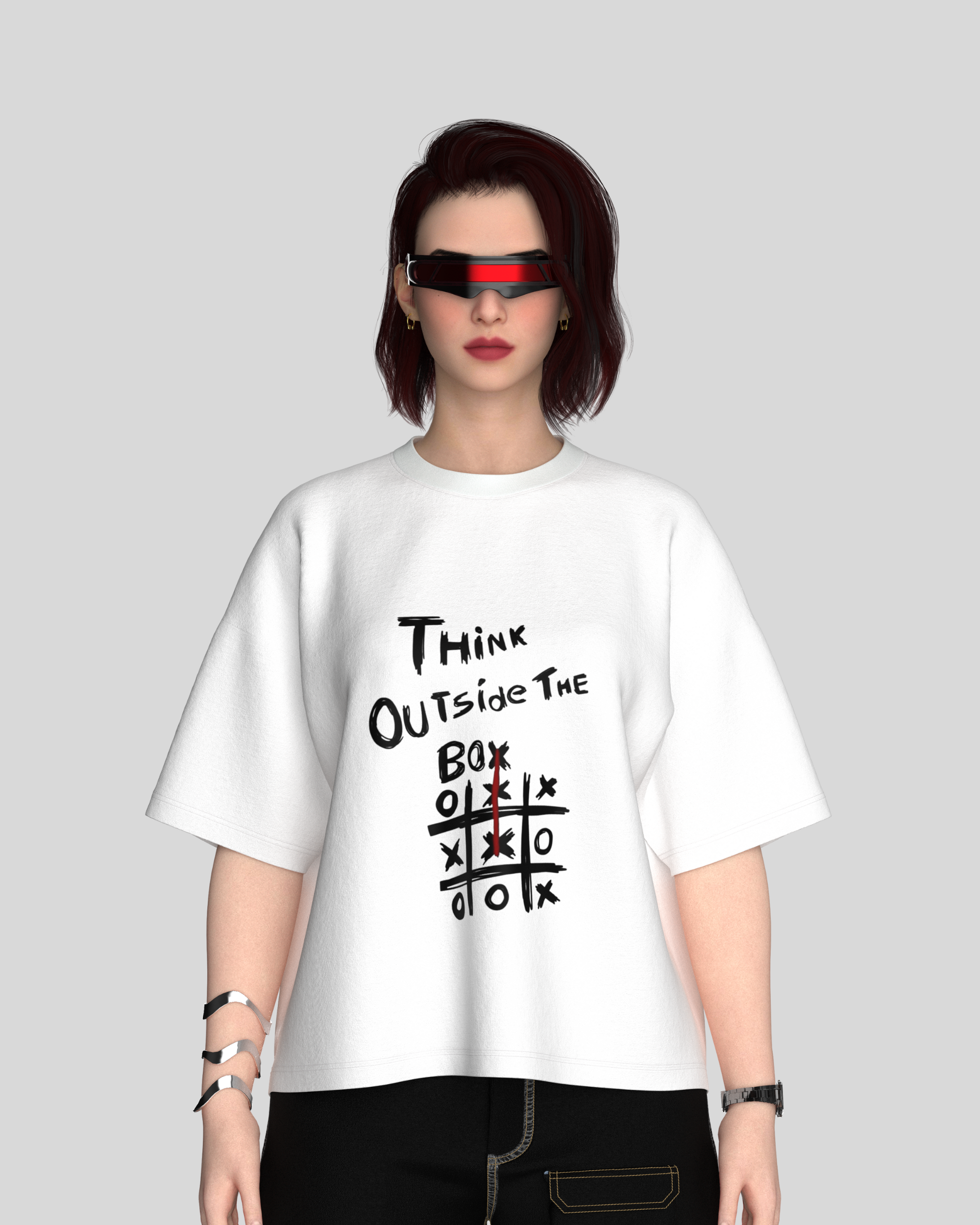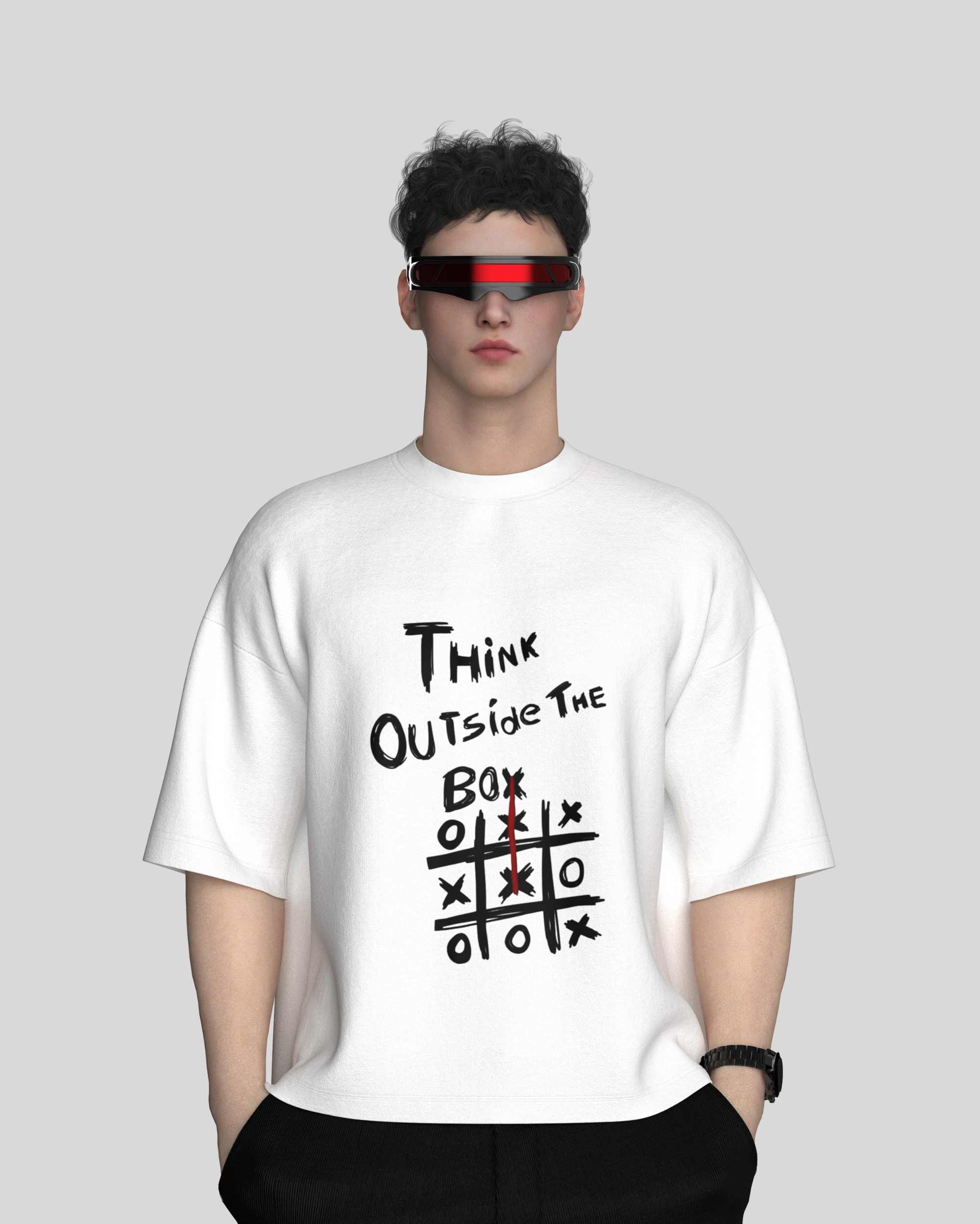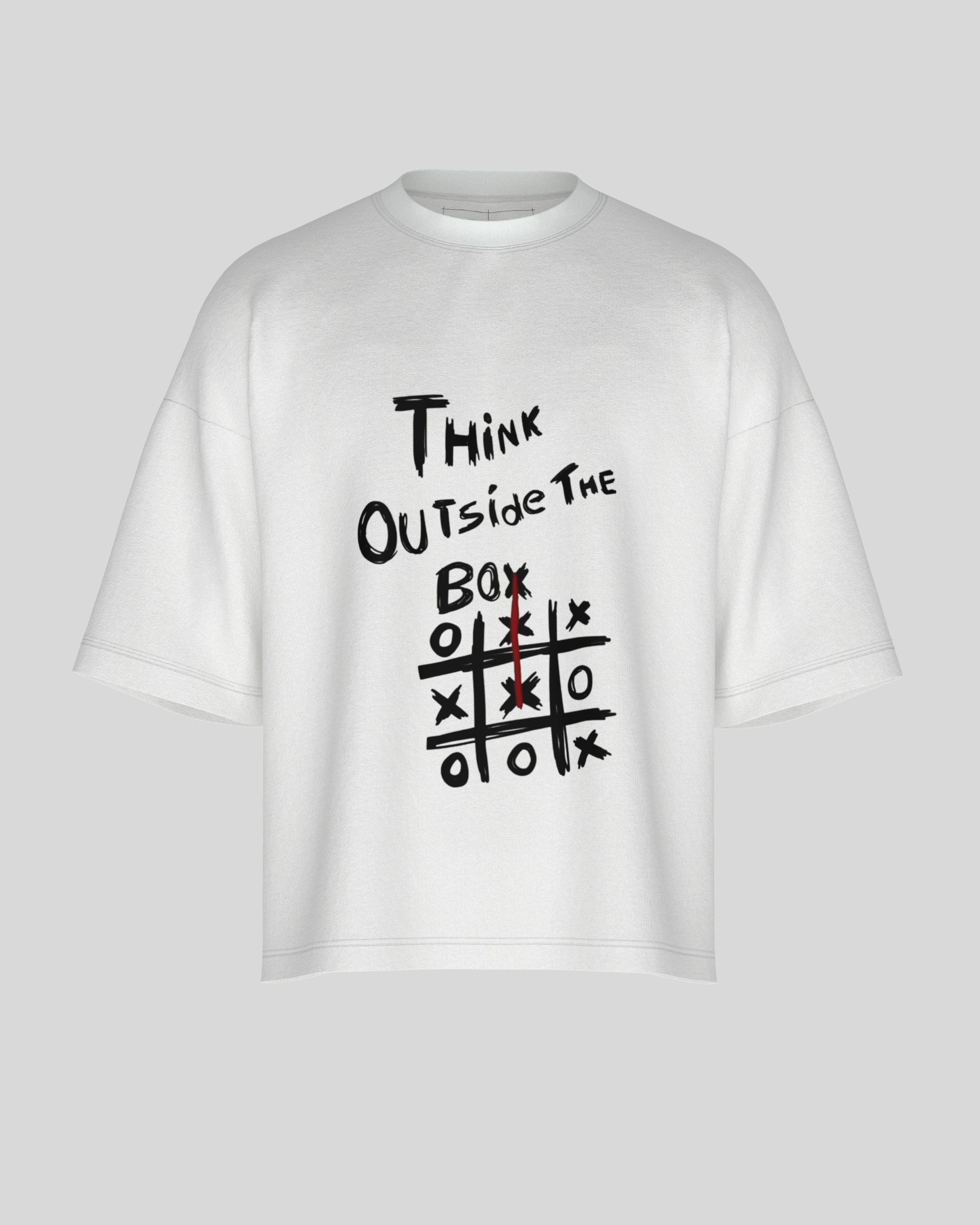 This premium oversized tee combines street-smart design with playful wit. Featuring a hand-drawn tic-tac-toe graphic with the bold phrase “Think Outside the Box,” it’s a wearable reminder to break the rules—both in style and in life. Crafted from 260 GSM terry-knit cotton blend, it delivers a soft-yet-structured drape that keeps its shape wear after wear.