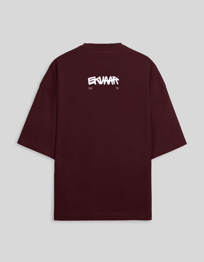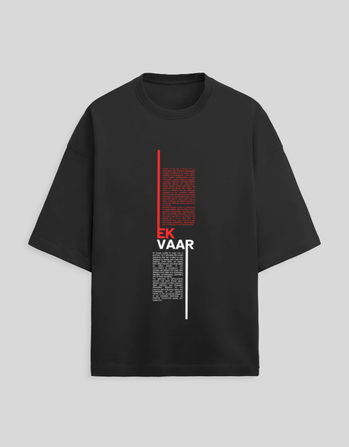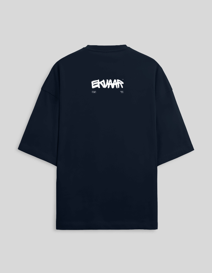 Crafted in 260 GSM terry-knit, this oversized tee balances premium hand-feel with bold design. The vertical line-text graphic and split-color typography spell EKVAAR in Agni Red, Noor Black, and Rui White—an Originals manifesto in print. Back and sleeve graffiti logos complete the layered streetwear aesthetic.